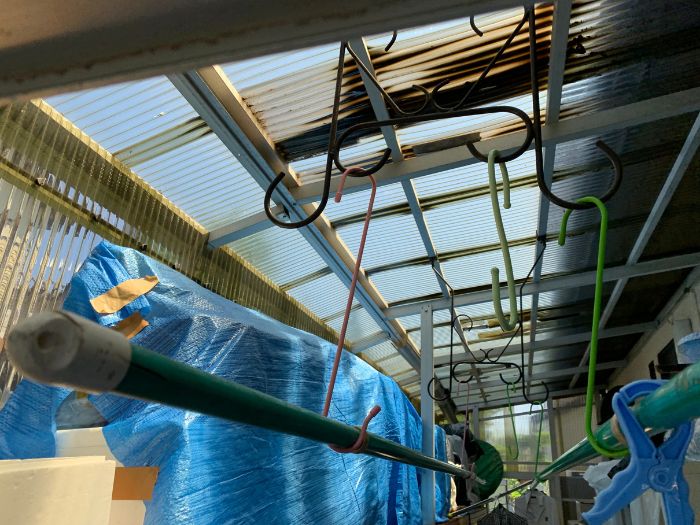 見えない部分で波板が割れていることが多く、そのままにしておくと次の風で大きく欠けたり、全面飛散のリスクがあります。