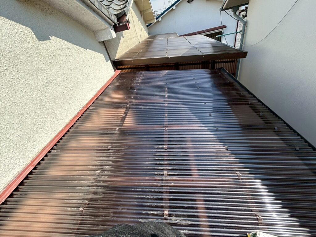 骨組みは再利用できたため、耐候性の高いポリカ波板(強風対策仕様)で張替えを実施し、6.9万円(税込)・短工期で安全に復旧しました。