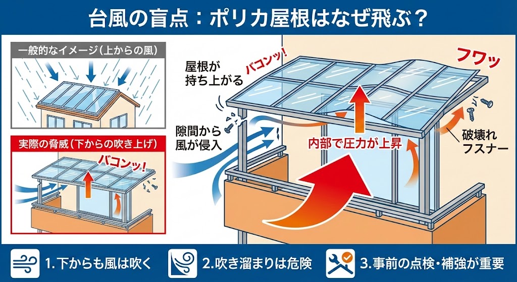 ポリカーボネート屋根は軽くて丈夫な反面、固定方法や劣化状態によっては台風時に外れや飛散が起こることがあります。