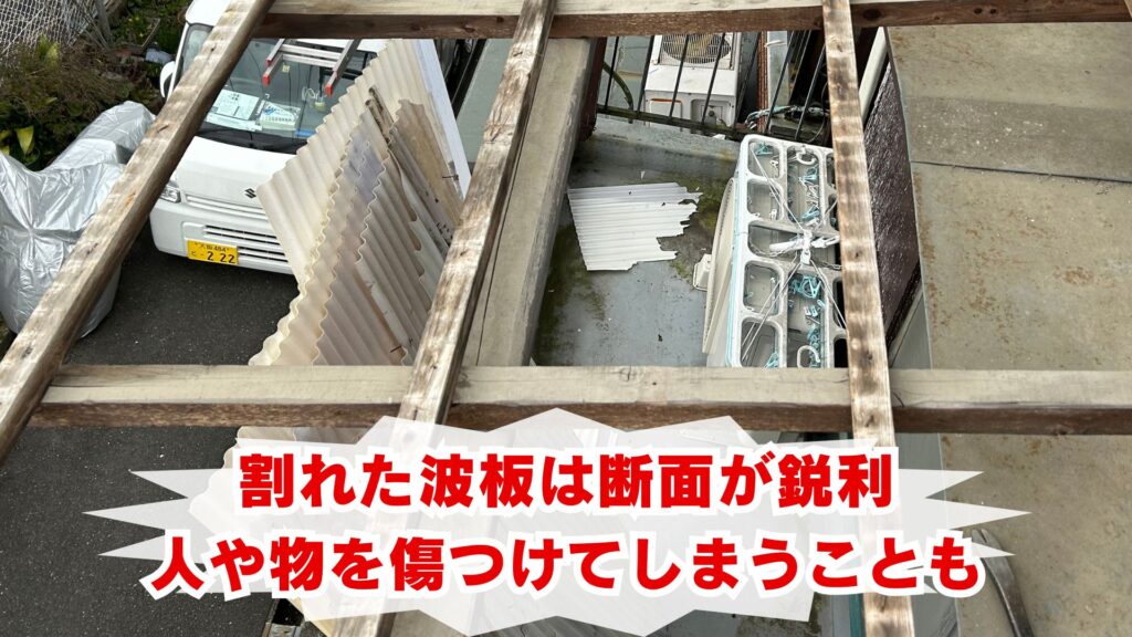 強風で飛ばされた波板が、隣の家や駐車中の車に当たり、修理だけでなく賠償問題に発展することもあります。
