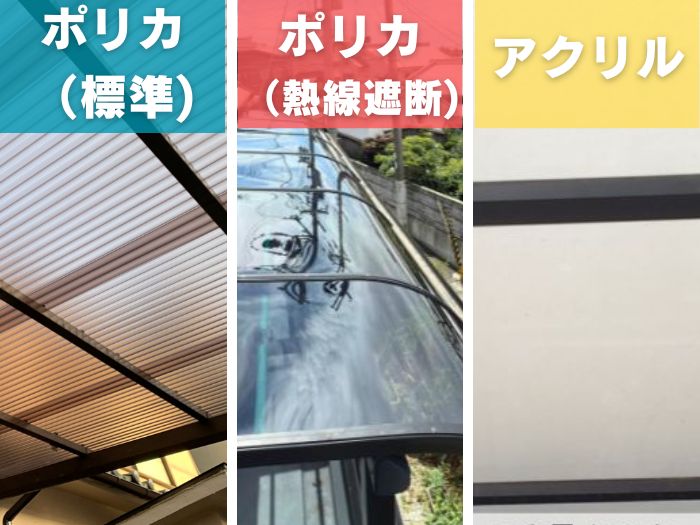 - ポリカーボネートが最も人気の素材で、特にサンルームは熱線遮断タイプが人気です。