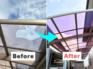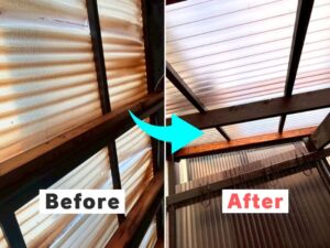 劣化した塩ビ波板を撤去し、耐久15〜20年以上のポリカーボネート波板へ交換!